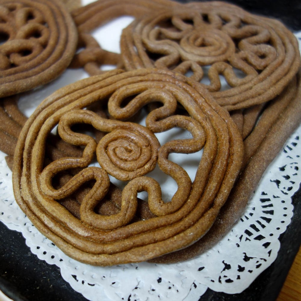 Teterki are made of dough rolled (or, as they say in Kargopolye — twisted) into bundles and spread — «curled» — in the circle in the form of waves or loops, spirals, lattices, circles, plants, figures of birds, or even animals.