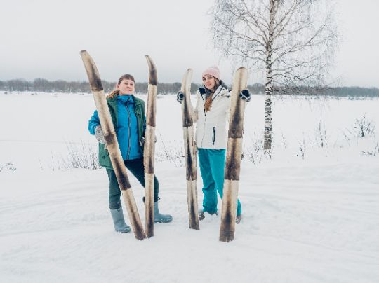 Экскурсия-поход по волшебной зимней тайге с освоением навыка ходьбы на камусных лыжах. Широкие самодельные деревянные лыжи, обитые «камусом» (шкурой с ног лося или оленя), помогают передвигаться по снегу и предотвращают скольжение при подъёме даже на крутые горки.