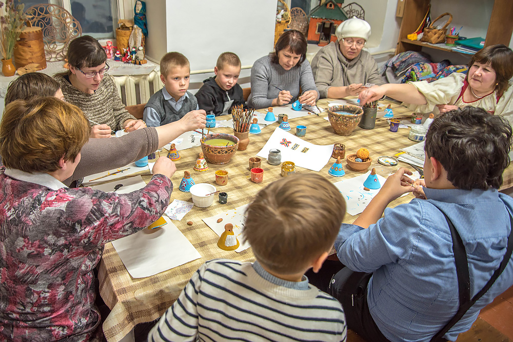 На столе — краски, вода в глиняных крынках, целые вязанки кисточек и образцы росписи на все случаи жизни. Мастер Надежда Евгеньевна Пригодина показывает элементы орнаментов, примеры сюжетов — и работа начинается. Кто-то выбирает традиционный каргопольский орнамент, другие импровизируют. Надежда Евгеньевна подсказывает как лучше наносить краски, помогает подправить контуры и подбадривает участников мастер-класса. За работой начинается разговор о ремёслах и традициях.