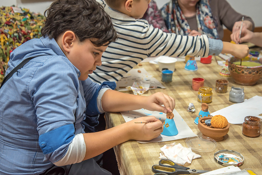 Тем временем, мастер-класс и разговоры шли своим чередом. Кто-то рисовал контур Христорождественского собора, кто-то ангелов и орнаменты. Один мальчуган поместил на свой колокольчик ангела, раскидистую ель и огромную красную вишню, а его старший брат Назар в это время активно выяснял у мастерицы, какой традиционный орнамент для чего используется, и рассказывал, что учится работать на гончарном круге. Оказалось, что Назар ещё и звонарь — самый младший участник фестиваля «Хрустальные звоны 2019»!