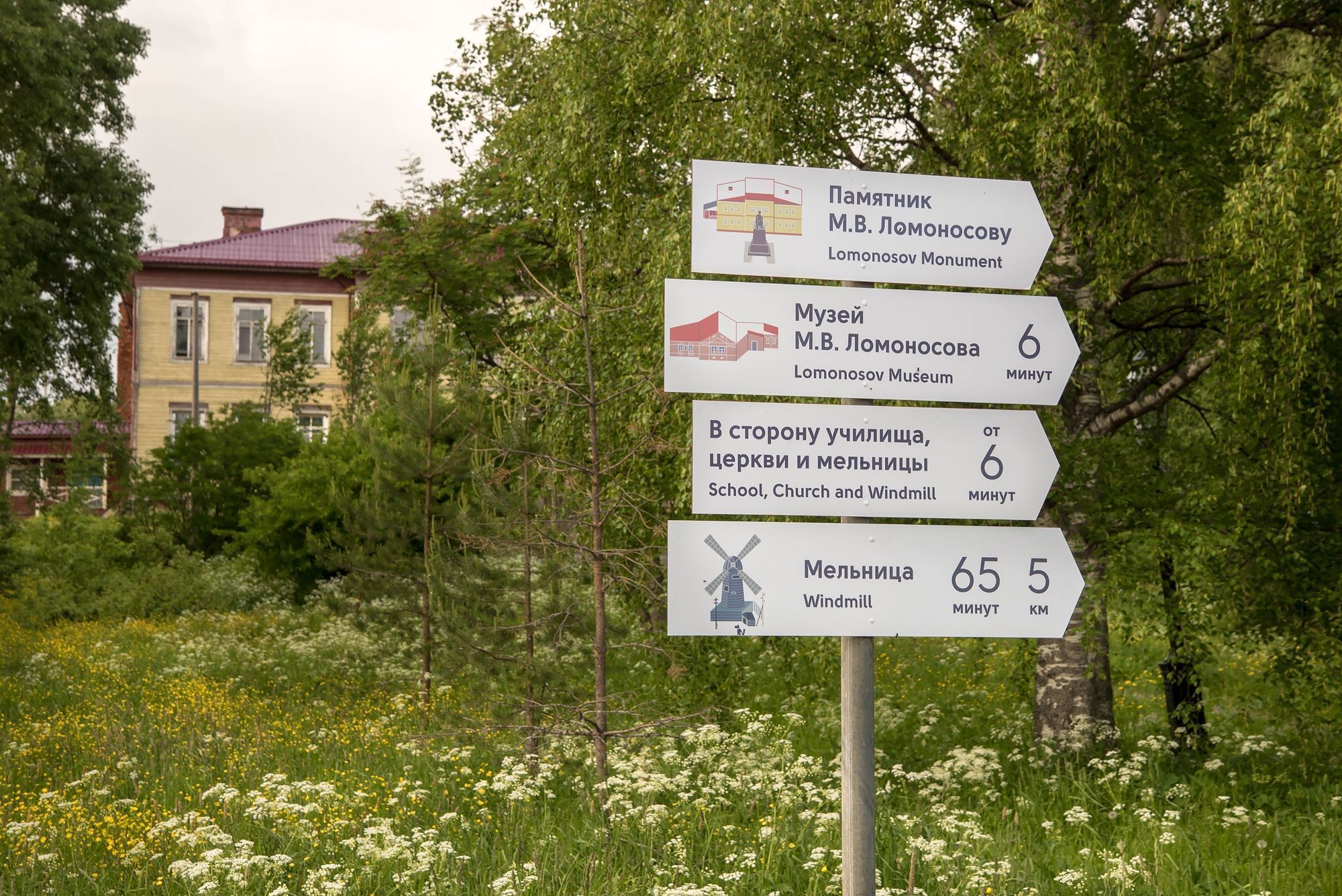 Вторая составляющая проекта — разработка туристической навигации на Курострове, где и располагается село Ломоносово. На острове установлены знаки туристической навигации, разработана уникальная в своем роде карта: здесь не просто указаны все дома, которые находятся на территории, они еще и выполнены в том же цвете, что и оригиналы, с такими же крышами и декоративными элементами.