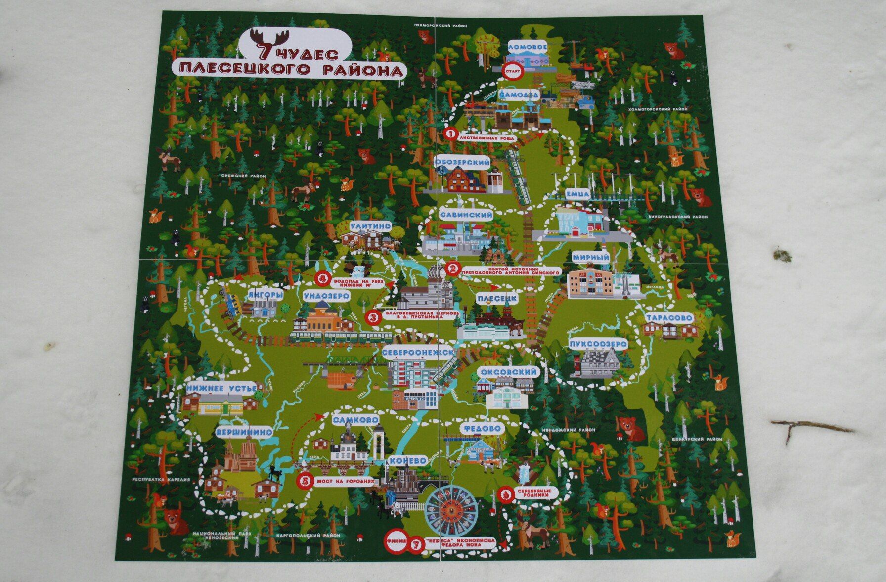 В ее основу легли подробная карта Плесецкого района, адаптированная для детей дошкольного и младшего школьного возраста, правила игры, упаковка. На карту нанесены административные центры района, природные объекты, дороги, водоемы, значимые местные достопримечательности. В ходе игры, дети перемещаются с самого северного населенного пункта района к самому южному (от старта к финишу), путешествуя по территории своего района и узнавая его географию и особенности. На карте существует 7 точек, попав на которые, игроки получают определенные бонусы. Побеждает тот, кто первым доберется до финиша.