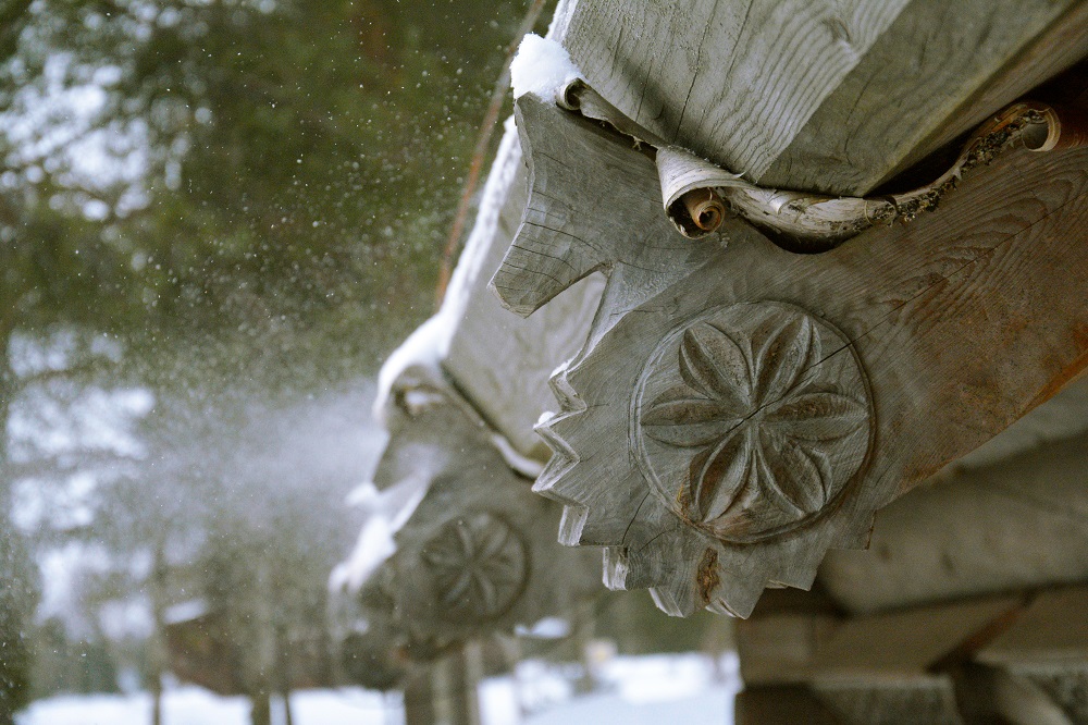 Резному декору в северных домах уделялось очень небольшое место, было трудно «одеть» всю постройку резьбой. На Русском Севере любили украшать крыльцо наружной лестницы на второй этаж, которая шла вдоль стены избы. Большое внимание придавалось оформлению массивного столба, на котором держалось крыльцо, напоминавшее сказочный теремок.