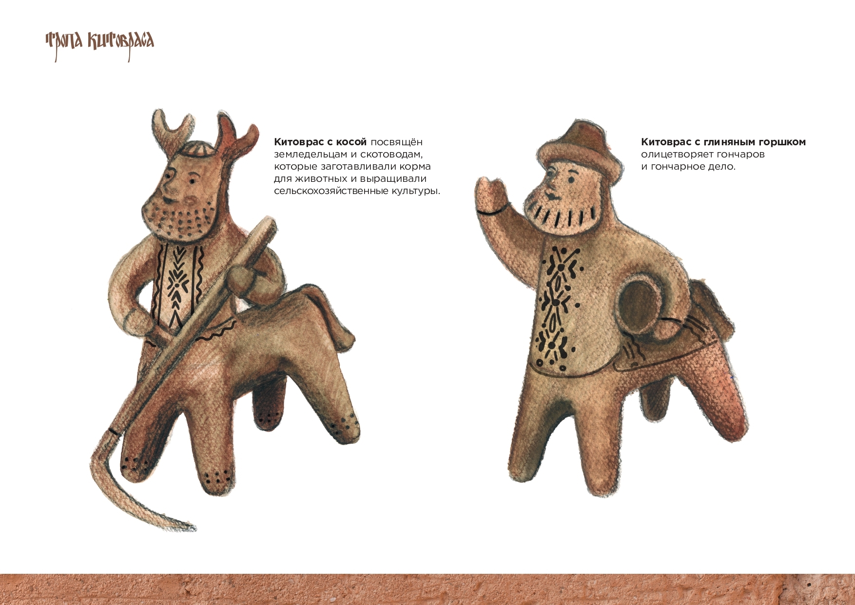 Китоврасы будут деревянными, но стилизованы под большие глиняные игрушки, какие делали местные мастера. Китоврас с косой посвящён земледельцам и скотоводам, его сосед с глиняным горшком в руках олицетворяет гончаров и гончарное дело.